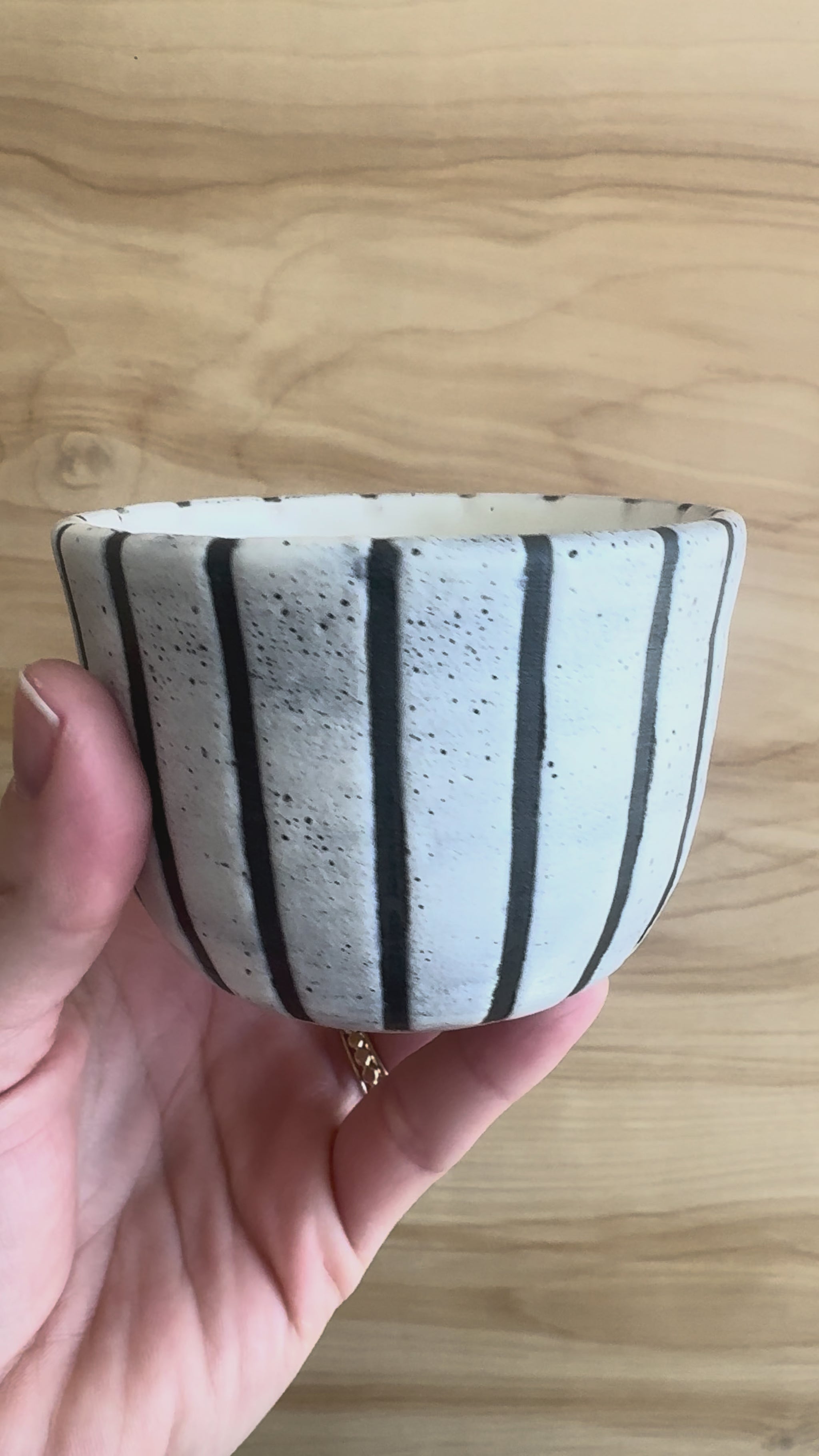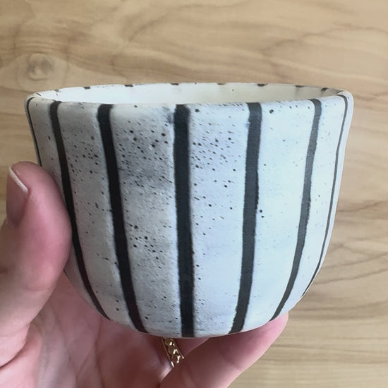 Handmade by Rachel Long, these tea cups feature a black matte thin stripe paired with a wider white glazed stripe pattern. They are a little wabi sabi as the white glaze speckles differently on each (an interaction with the kiln firing process).