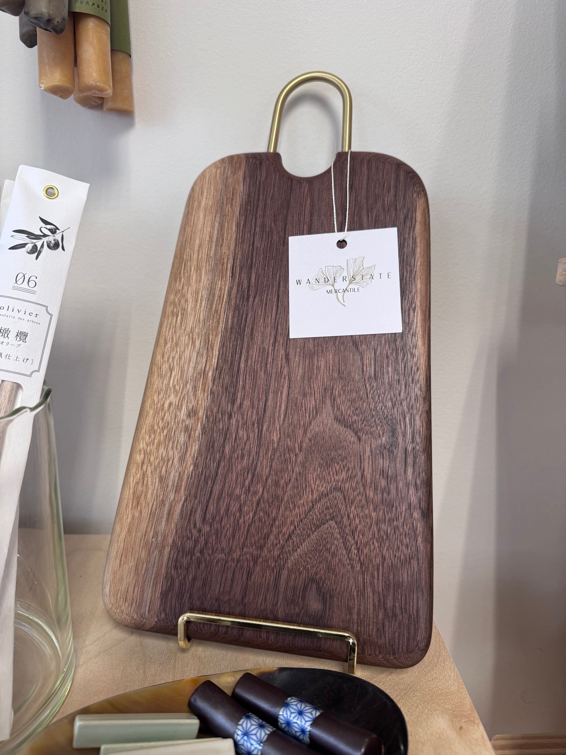 This is a welcome addition to your kitchen collection, perfectly suited to your hosting and entertaining needs! A lovely board made sustainably milled urban Walnut and a premium brass hardware handle for easy holding and hanging.