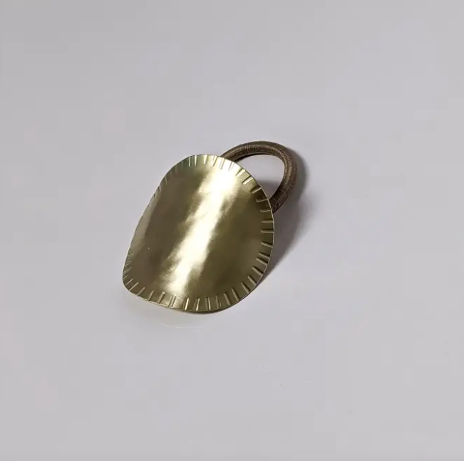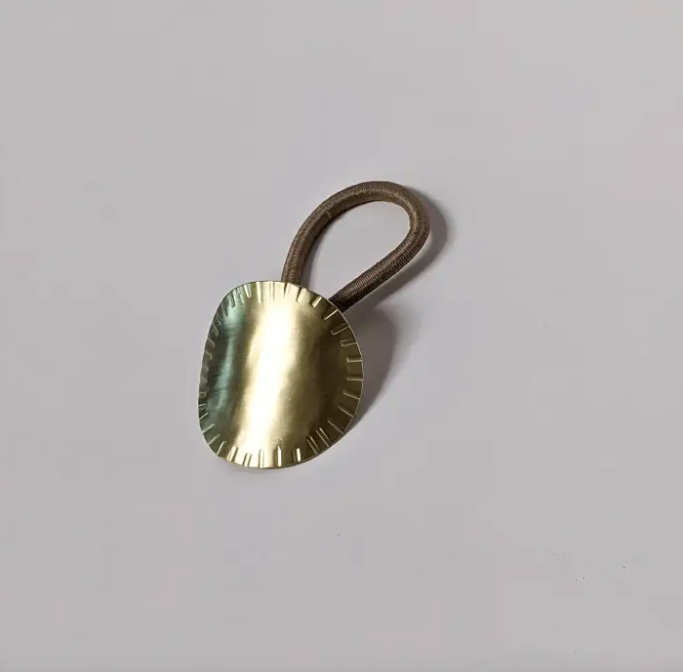 Elevate your ponytail with 2 sizes of beautiful brass oval(ish) discs which hug your hair perfectly. These hand tooled, one of a kind pieces come in two sizes along with gentle, changeable hair bands that work with both thick and fine hair. Since these pieces are handcrafted and hand polished there may be subtle differences.