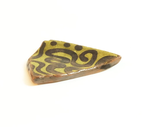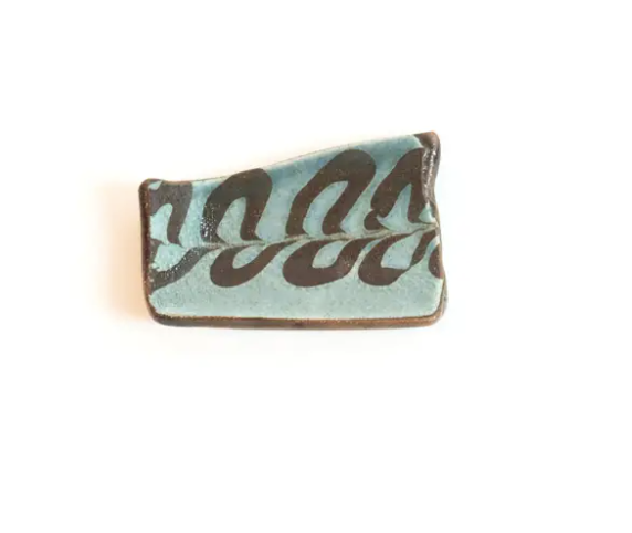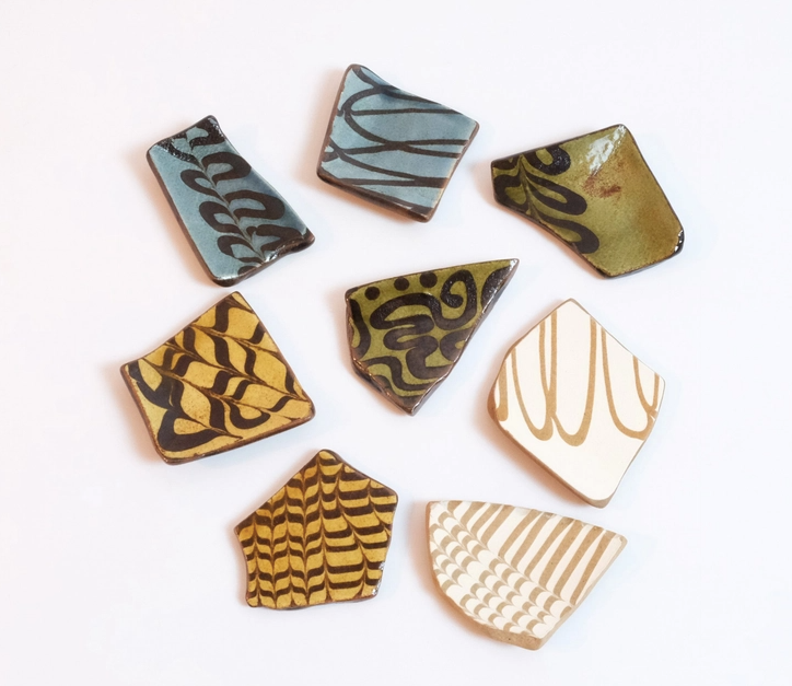 Ibaraki based ceramicist Giran Sagawa specialises in geometric slipware. These fragments of his work are made to be used as cutlery rests, such as chopsticks. They provide a miniature introduction to his hand patterned ceramics. Showing some of the influence of British ceramic styles on Japanese ones down the years, Sagawa takes the application of slip (a clay slurry used for decoration) to ceramics in a contemporary direction - with elements that recall graffiti alongside neat dripper applied designs.