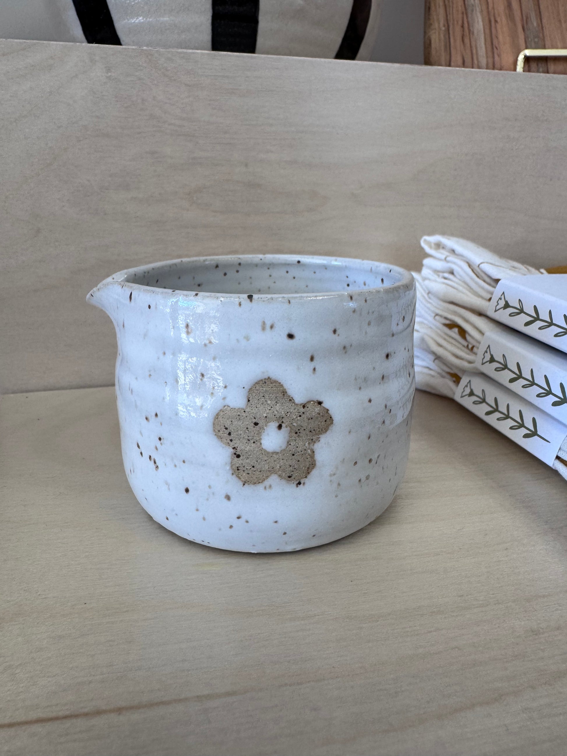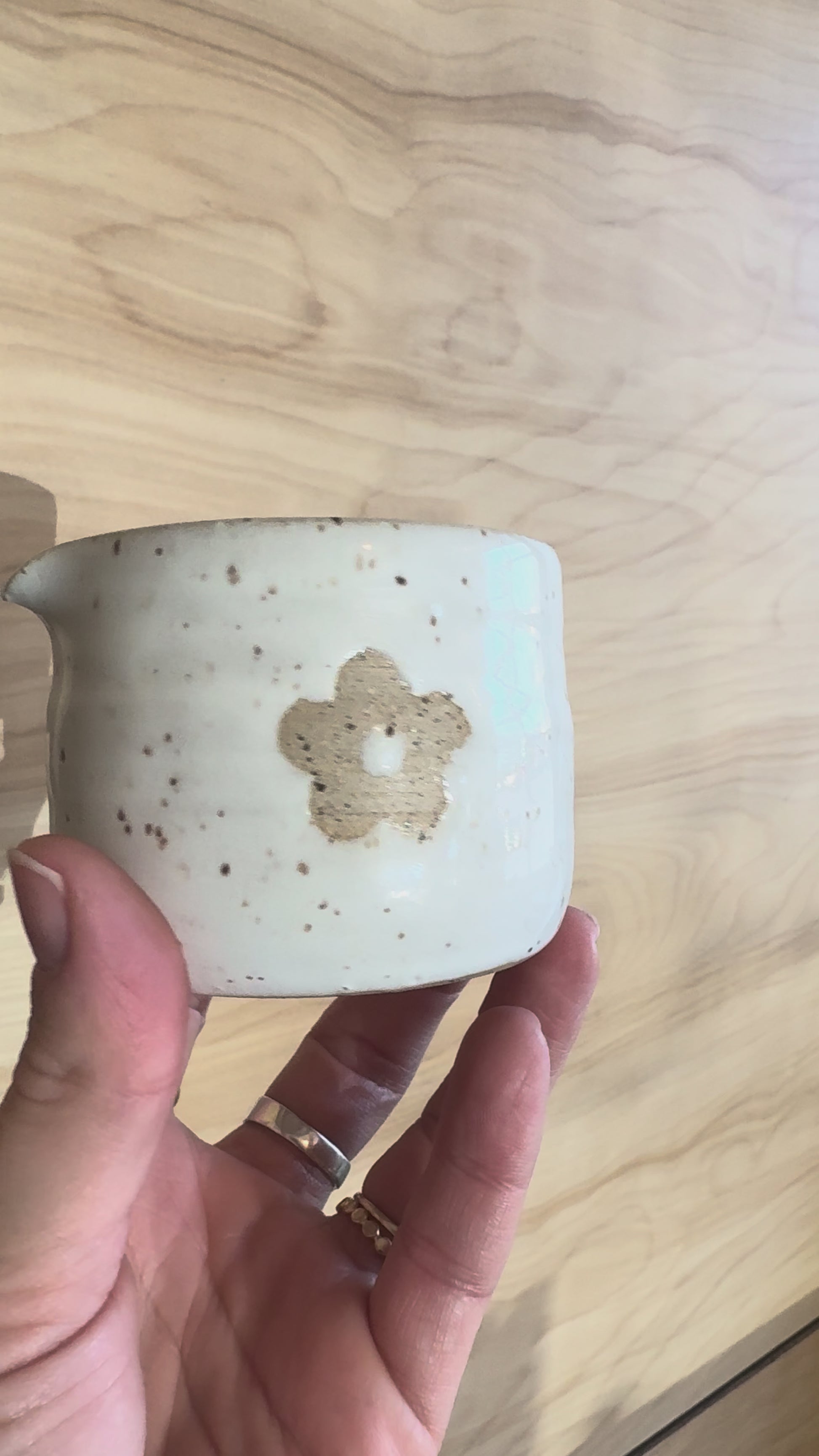 A white speckle glaze surrounds a raw clay daisy motif that runs around the pitcher. Instant cuteness added to your kitchen! Use this under the group head of your espresso machine to then pour easily into a larger cup or use it for creamer, salad dressings, or to heat up syrups in the microwave!