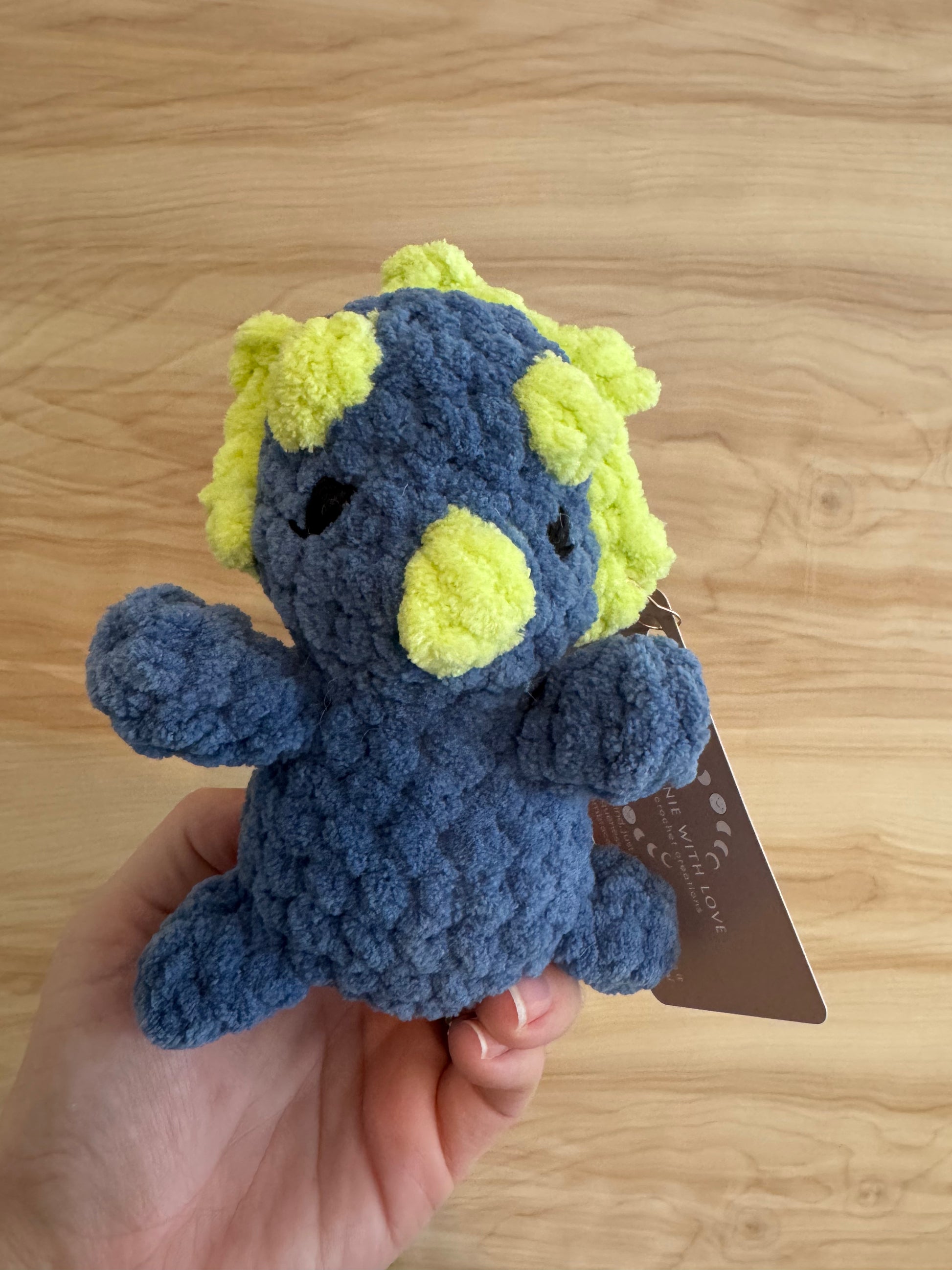 A cute dinosaur snuggly for babies! Made from super soft yarn and hand crocheted, these make a sweet addition to any baby gift.