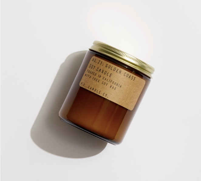 Imagine Big Sur magic, wild sage baking in the sun, the rumble of waves and rocks. This candle has notes of eucalyptus, sea salt, redwood, and palo santo. It's a perfect size for dressers, countertops, and nightstands – basically everywhere. Hand-poured into apothecary inspired amber jars with P.F. Candle Co. signature kraft label and a brass lid.
