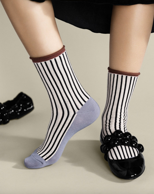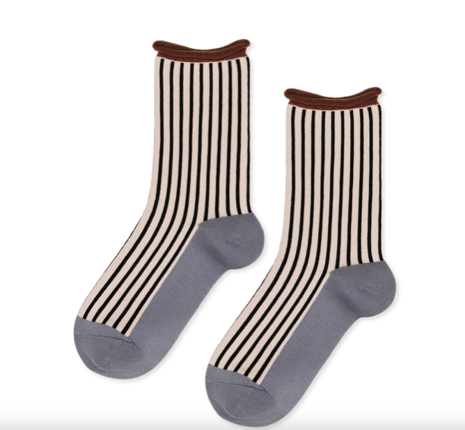 Freshen up your sock game with these striped stunners. The color blocking on the toe and sole make them stand out, while the rolled cuff adds a touch of personality. A simple yet versatile pebble grey with taupe and black stripe combo add a bit of fun to your outfit!