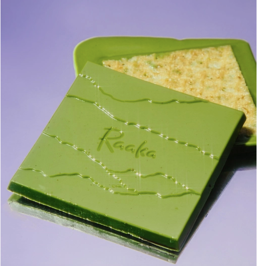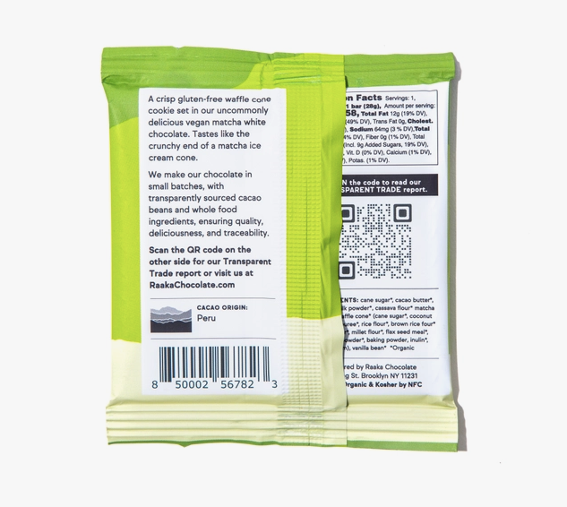 A 2024 Nexty Award winner. A crisp gluten-free waffle cone cookie set in Raaka's uncommonly delicious and ultra creamy vegan matcha coconut white chocolate. Tastes like the crunchy end of matcha ice cream packed in a cone.