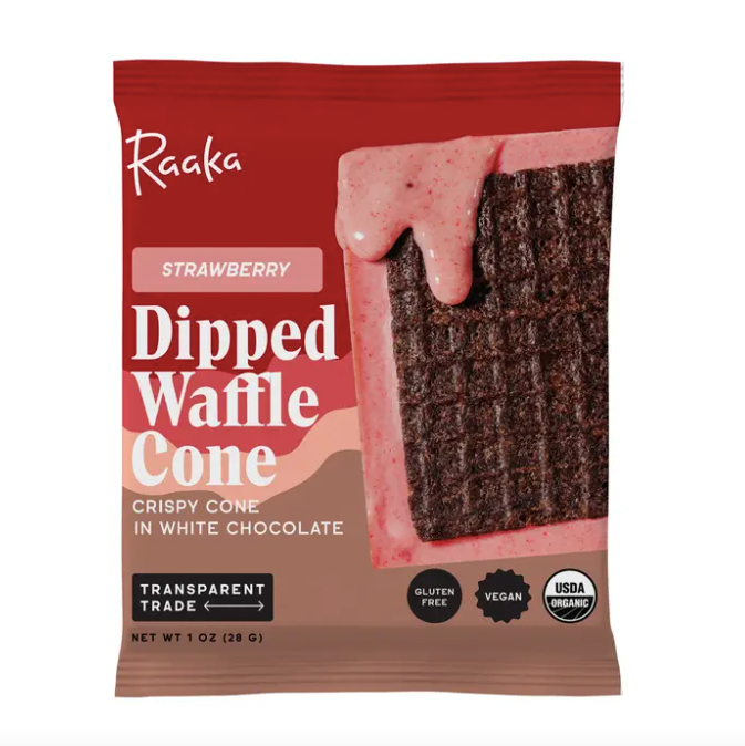 Raaka's special Valentine's edition of their waffle cone chocolate is here! A crisp gluten-free chocolate waffle cone cookie set in our uncommonly delicious, vegan coconut strawberry white chocolate flavored with whole freeze dried strawberries and vanilla bean. This creamy, fruity, sweet, and berrylicious white chocolate is not to be missed: One bite and your heart will break.