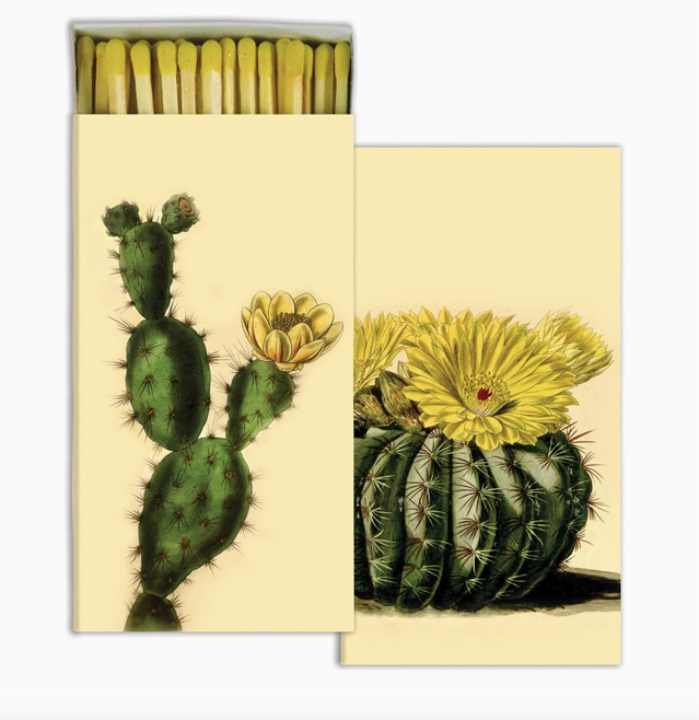 Pair a match box with a candle for a perfect gift. Think hostess gift, housewarming, birthday, or just thinking of you occasion. With yellow match tips, the vintage style cacti prints and a touch of nature that goes with many decor styles.