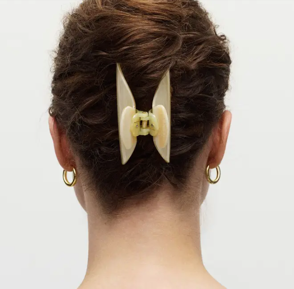 A double-walled hair claw designed to hold medium volumes of hair, handcrafted from Italian acetate with reinforced hardware.