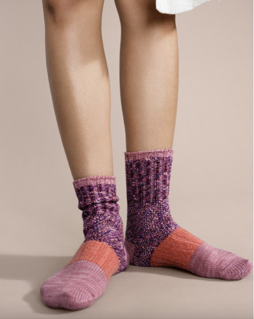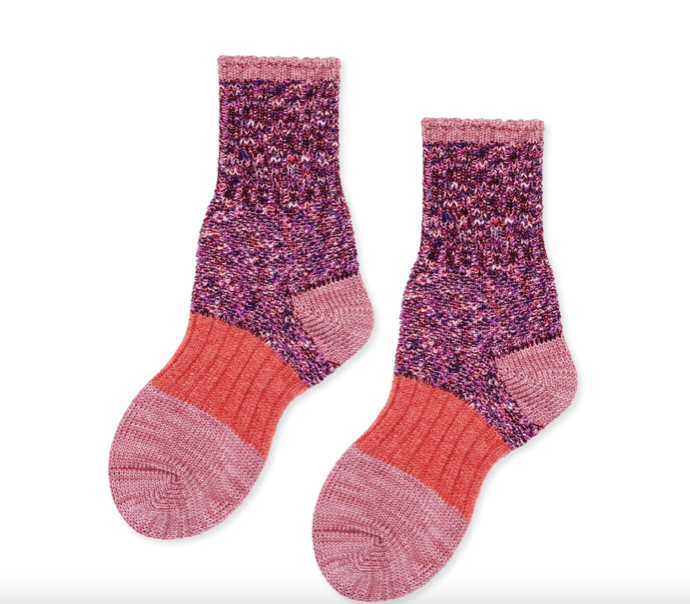 The perfect boot sock - this one is chunky in all the right places and bursting with tons of personality (and texture)! Now in an updated yarn, called Pixie! As part of the Made in Japan "Varsity Series", these slub cotton knits are made on a special low gage machine that give it that unique vintage look.