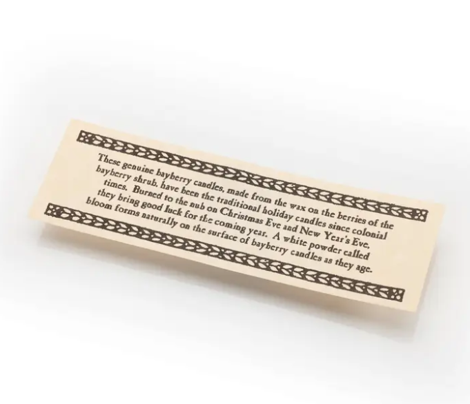 Made from the wax on the berries of the bayberry shrub, these candles have been traditional holiday candles since colonial times. Burned to the nub on Christmas Eve and New Year's Eve, they bring good fortune and luck to the coming new year.
