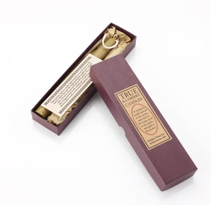 A beautiful Holiday gift filled with nostalgia! 8" real bayberry taper candles are hand dipped on a circa 1850 candle carousel. These are the traditional candles to be burned on Christmas Eve and New Year's Eve. The beautiful presentation in the gift box makes this a wonderful hostess present.