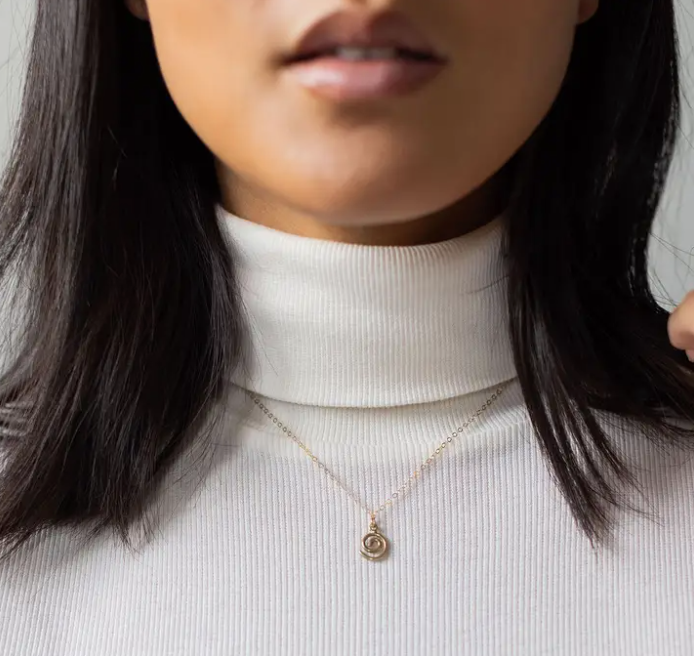 A tiny spiral charm suspended on a chain. A go to necklace that goes with anything!
