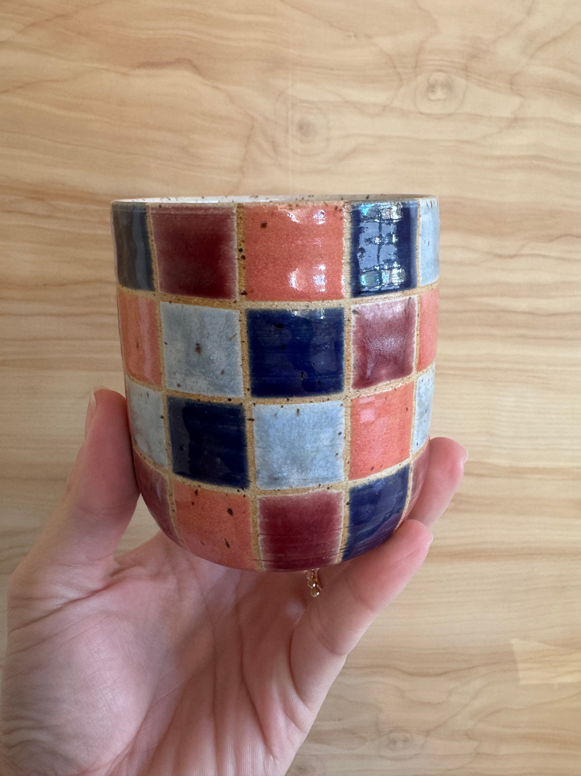 This handmade and glazed grid tumbler reminds us us Fall on the East Coast. A mix of dark blues, saturated pink, and burgundy come together for a fun cup you can use for coffee, lattes, and tea.